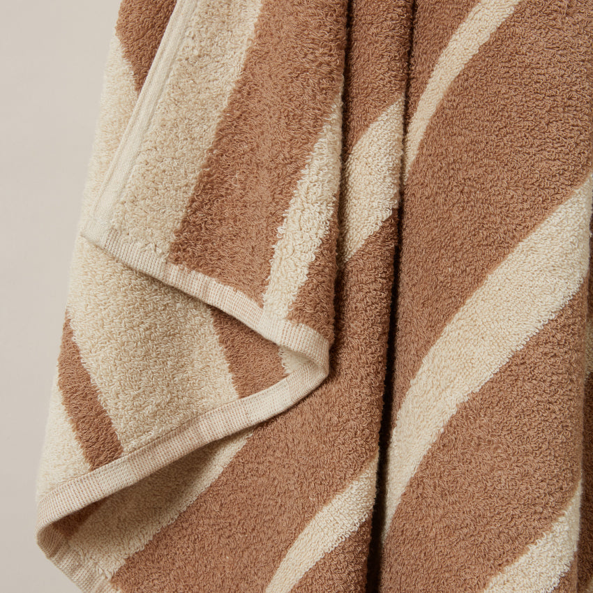 The Bondi towel is effortless sophistication — featuring clean vertical stripes in alternating widths, with a reverse pattern on the back for twice the style. Crafted from 100% natural cotton and available in Caramel or Black, it’s a timeless essential that feels at home on the sand or in your space.
